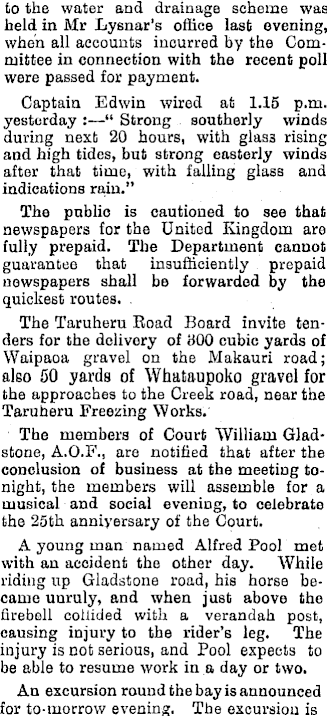 to the water and drainage scheme was held in Mr Lysnar’s office last evening, when all accounts incurred by the Committee in connection with the recent poll were passed for payment. Captain Edwin wired at 1.15 p.m. yesterday “ Strong southerly winds during next 20 hours, with glas3 rising and high tides, but strong easterly winds after that time, with falling glass and indications rain.” The public is cautioned to see that newspapers for tho United Kingdom are fully prepaid. The Department cannot guarantee that insufficiently prepaid newspapers shall be forwarded by the quickest routes. The Taruheru Road Board invite tenders for the delivery of 300 cubic yards of Waipaoa gravel on the Makauri road; also SO yards of Whataupoko gravel for the approaches to the Creek road, near the Taruheru Freezing Works. The members of Court William Gladstone, A.0.F., are notified that after the conclusion of business at the meeting tonight, the members will assemble for a musical and social evening, to celebrate the 25th anniversary of the Court. A young man named Alfred Pool met with an accident the other day. While riding up Gladstone road, his horse became unruly, and when just above the firebell collided with a verandah post, causing injury to the rider’s leg. The injury is not serious, and Pool expects to be able to resume work in a day or two. An excursion round the bay is announced for to-morrow evening. The excursion is