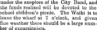 under the auspices of the City Band, and the funds realised will be devoted to the school children’s picnic. The Waihi is to leave the wharf at 7 o’clock, and given fine weather there should be a large number of excursionists.
