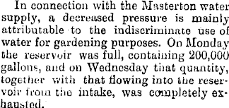 In connection with the Masterton watersupply, a decreased pressure is mainly attributable to the indiscriminate use of water for gardening purposes. On Monday the reservoir was full, containing 200,000 gallons, and on Wednesday that quantity, together with that flowing into the reservoir from the intake, was completely exhausled.