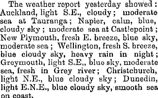 The weather roport yesterday showed : Auckland, light S.E., cloudy; moderate sea at Tauranga; Napier, calm, blue, cloudy sky ; moderate sea at Castlepoint; New Plymouth, fresh E. breeze, blue sky, moderate sea ; Wellington, fresh S. breeze, blue cloudy sky, heavy rain in night; Greymouth, light S.E„ blue sky, moderate sea, fresh in Grey river; Christchurch, light N.E., blue cloudy sky; Dunedin, light E.N.E., blue cloudy sky, smooth sea on coast.