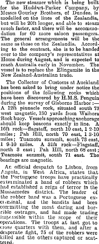 The new steamer which is being built for tho Huddart-Parker Company, by Messrs Gourlay Brothers, of Dundee, is modelled on the lines of the Zealandia, but will be 20ft longer, and able to steam much faster, and there will he accommodation for 60 more saloon passengers. The general arrangements will be the same as those on the Zealandia. According to the contract, she is to be handed over to tho company’s representatives at Home during August, and is expected to reach Australia early in November. The vessel is to replace the Elingamite in the New Zealand-Australian trade. The Collector of Customs at Auckland has been asked to bring under notice the positions of the following rooks which have been discovered by H.M.S. Penguin during the survey of Gisborne Harbor : A 12ft pinnacle rook, situated south 73 west magnetic, 130 yards from Waihora Rock buoy. Vessels approaching anchorage should keep beacons exactly in line. A 16ft rock —flagstaff, north 10 east, 1 2-10 miles; Pah Hill, north 70 east, 1 3-10 miles; Tuamotu summit, south 73 east, 1 9-10 miles. A 31ft rock—Flagstaff, north 3 east; Pah Hill, north 68 east; Tuamotu summit, south 71 east. The bearings are magnetic. An official despatch to Lisbon, from Angola, in West Africa, stales that the Portugqese troops have practically exterminated a band of robbers which had established a reign of terror in the Mossamedes district. The leader of the robber band was a Portuguese exci.n.inal, and the bandits had been committing the most daring and horrible outrages, ami had made trading impossible within the scope of their operations. The troops at last got to close quarters witli them, and after a desperate fight, 75 of the robbers were killed and the others captured or scattered.