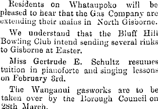 Residents on Whataupoko will be pleased to hear that the Gas Company are extending their mains in North Gisborne. We understand that the Bluff Hill Bowling Club intend sending several rinks to Gisborne at Easter. Miss Gertrude E. Schultz resumes tuition in pianoforte and singing lessons on February 3rd. Tiie Wanganui gasworks are to be taken over by the Borough Council on 23th March.