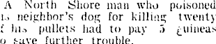 A North Shore man who poisoned H.> neighbor’s dog for killing twenty if in.-, pullets had to pay ,"> guineas .0 save further trouble.