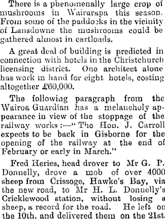 There is a phenomenally large crop of mushrooms in Wairarapu this season. From somo of the paddocks in the vicinity of Lansdowne the mushrooms could be gathered almost in cartloads. A great deal of building is predicted in connection with hotels in the Christchurch licensing district. One architect alone has work in hand for eight hotels, costing altogether £60,000. The following paragraph from the Wairoa Guardian has a melancholy appearance in view of the stoppage of the railway works : —“ Tho Hon. J. Carroll expects to be back in Gisborne for the opening of the railway at the end of February or early in March.” Fred Series, head drover to Mr G. P. Donnelly, drove a mob of over 4000 sheep from Crissoge, Hawke’s Bay, via the new road, to Mr H. L. Donnelly’s Crieklewood station, without losing a sheep, a record for the road. He left on the 10th, and delivered them on the 21st.