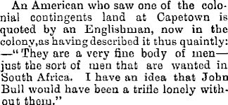 An American who saw one of the colonial contingents land at Capetown is quoted by an Englishman, now in the colony,as having described it thus quaintly: —“ They are a very fine body of men — just the sort of men that are wanted in South Africa. I have an idea that John Bull would have been a trifle lonely without them.”