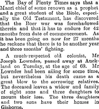 The Bay of Plenty Times says that a Maori chief of some renown as a prophet, and a great student of the Bible, especially the Old Testament, has discovered that the Boer war was foreshadowed therein and that it has to endure for 42 months from date of commencement. As it has been going on now for 27 months he reckons that there is to bo another year and three months’ fighting. A much-respected old colonist, Mr Joseph Lowndes, passed away at Auckland on Tuesday, at the age of 69. Mr Lowndes had been ailing for some time, but nevertheless his death came as a great blow to the sorrowing relatives. The deceased leaves a widow and family of oight sons and three daughters to mourn their loss. The three daughters and two sons have their homes in Gisborne.