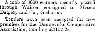 A mob of 3000 wethers recently passed through Wairoa, consigned to Messrs Dalgety and Co., Gisborne. Tenders have been accepted for new premises for the Dannevirke Co-operative Association, totalling £2102 2s.