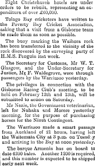 Eight Christchurch hotels are under orders to be rebuilt, representing an expenditure of over £60,000. Tolago Bay cricketers have written to the Poverty Bay Cricket Association, asking that a visit from a Gisborne team be made them as soon as possible. The buoy marking the Waihora rook has been transferred to the vicinity of the rock discovered by the surveying party of H.M.S. Penguin last week. The Secretary for Customs, Mr W. T. Glasgow, and the Under-Secretary for Justice, My F. Waldegrove, were through passengers by the Warrimoo yesterday. The privileges in connection with the Gisborne Racing Club’s meeting, to be held on February 12th and loth, will be submitted to action on Saturday. Mr Neale, the Government veterinarian, left for Nuhaka and Morere yesterday morning, for the purpose of purchasing horses for the Ninth Contingent. The Warrimoo made a smart passage from Auckland of 21 hours, having left the Waitemata City at 3 p.m. on Tuesd:.y and arriving in the Bay at noon yesterday. The barque Armenia has on board to date 4200 bales. Another 1200 is required, and this number is expected to be shipped early next week.