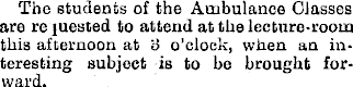 The students of the Ambulance Classes are re juested to attend at the lecture-room this afternoon at o o’clock, when an interesting subject is to he brought forward.