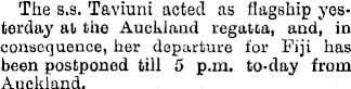 The s.s. Taviuni acted as flagship yesterday at the Auckland regatta, and, in consequence, her departure for Fiji has been postponed till 5 p.m. to-day from Auckland.