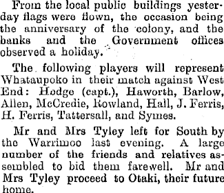 From the local public buildings yesterday flags were flown, the occasion being the anniversary of the colony, and the banks and the Government offices observed a holiday. The following players will represent Whataupoko in their match against West End: Hodge (capt.), Haworth, Barlow, Allen, McCredie, Rowland, Hall, J. Ferris, H. Ferris, Tattersall, and Byrnes. Mr and Mrs Tyley left for South by the Warrimoo last evening. A large number - of the friends and relatives assembled to bid them farewell. Mr and Mrs Tyley proceed to Otaki, their future home.