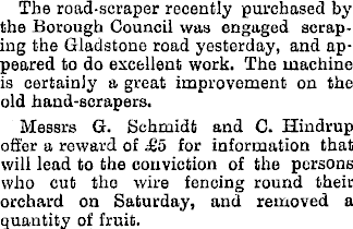 The road-scraper recently purchased by the Borough Council was engaged scraping the Gladstone road yesterday, and appeared to do excellent work. The machine is certainly a great improvement on the old hand-scrapers. Messrs G. Schmidt and C. Hindrup offer a reward of £5 for information that will lead to the conviction of the persons who cut the wire foncing round their orchard on Saturday, and removed a quantity of fruit.