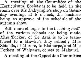 A meeting ot the Committee of - the Horticultural Society is to be held in the room over Mr Dalrymple’s shop on Saturday evening, at 8 o’clock, the business being to approve of the schedule of the autumn show. Still more changos in the teaching staffs of the various schools are being made. Miss Tucker, of Te Arai, is to be transferred to a Hawke’s Bay school ; Miss Siddells, of Morere, to Elsthorpe.'and Miss Forbett, of Waipawa, comes to Makauri. A meeting of the Opposition Committee