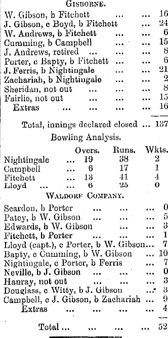 Gisborne, W. Gibson, b Fitchett 16 J. Gibson, c Boyd, b Fitchott 24 W. Andrews, b Fitchett 6 Cummiug, b Campbell 15 J. Andrews, retired 8 Porter, c Bapty, b Fitchett ... 6 J. Ferris, b Nightingale •21 Zaehariab, b Nightingale Sheridan, not out 8 Fairlie, not out 15 Extras 16 Total, innings declared closed . 137 Bowling Analysis. Overs. Buns. Wkts. Nightingale ... 19 38 2 Campbell ... 6 17 i Fitchett ... 13 41 4 Lloyd ... ... 6 25 0 Waldorf Company. Scardon, b Porter . 0 Patoy, b W. Gibson . 5 Edwards, b W. Gibson ;.. . 3 Fitchett, b Porter . 1 Lloyd (capt.), c Porter, b W. Gibson Bapty, c Gumming, b W. Gibson . 7 . 10 Nightingale, c Porter, b Ferris . 7 Neville, b J. Gibson . 0 Hanray, not out . 3 Douglass, e Witty, b J. Gibson .* 3 Campbell, c J. Gibson, b Zachariah . 9 Extras . 4 Total 52