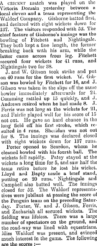 A crickht match was played on the Victoria Domain yesterday between a local eleven and a team representing the Waldorf Company. Gisborne batted first, and declared with eight wickets down for 137. The visitors responded with 52. The chief feature of Gisborne’s innings was the bowling of Fitebott and Nightingale. They both kept a fine length, the former breaking back with his arm, while the latter came across from leg. Fitchett secured four wickets for 41 runs, and Nightingale two for 38. J. and W. Gibson took strike and put on 40 runs for the first wicket. V. Gibson was bowled by Fitchett for 16, and J. Gibson was taken in the slips off the same bowler immediately afterwards for 24. Gumming rattled up 15 quickly, and .1. Andrews retired when he hud made 8. 4. Ferris was not long at the wickets for 21, and Fairlio played well for his score of 15 not out. He gave an hard chance in the long' field off his first stroke, which resulted in 4 runs. Shoudun was not out for 8. The innings was declared closed with eight wickots down for 137 runs. Porter opened to Scardon, whom he cleaned bowled with his fourth ball. The wickets fell rapidly. Patey stayed at the wickets a long time for 5, and saw half the team retire before he lost his wicket. Lloyd and Bapty made a brief stand, putting on 20 runs. • Nightingalo and Campbell also batted well. The innings closed for 52. The Waldorf representatives were jubilant at passing the score of the Penguin team on the preceding Saturday. Porter, W. and J. Gibson, Ferris, and Zachariah all secured wickets. The fielding was lifeless. There was a large number of spectators on tbo ground, and the road-way was lined with equestrians. Miss Waldorf was present, and evinced much interest in the game. The following are the scores -