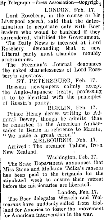 By Telegraph—Press Association—Oopyrigbj LONDON, Feb. 17. Lord Rosebery, in the course of Ms Liverpool speech, said that the determination to negotiate only with Boer leaders who would be banished if they surrendered, stultified the Government. The Daily News is incensed at Lord Rosebery demanding that a new Liberal party must abandon mouldy programmes. ’the Freeman’s Journal denounces the naked shamelessness of Lord Roseberv’s apostacy. ST. PETERSBURG, Feb. 17. Russian newspapers calmly accept the Anglo-Japanese treaty, professing it, to he identical witlh the principles of Russia’s policy. BERLIN, Feb. 17. Prince Henry denies writing to Admiral Dewey, though he admits that he remarked to the American Ambassador in Berlin in reference to Manila, “ We made a great error.” MELBOURNE, Feb. 17. Arrived : The steamer Talune, fnwi New Zealand. Washington, Feb. 17. The State Department announces that Miss Stone and Madame Tsilka’s ransom has been paid to the brigands for the stipulated week to ensure their retreat before the missionaries are liberated. London, Feb. 17. Tho Boer delegates Weasels and Wolmarans have suddenly sailed from Holland for America to foster the movement for American intervention in the war.