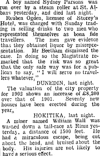 A boy named Sydney Parsons was run over by a steam roller at St. Albans yesterday, and died last night." Reuben Ogden, licensee of Storey’s Hotel, was charged with Sunday trading in selling drinks to two men who represented themselves as bona fide travellers. The men gave evidence thar they obtained liquor by misrepresentation. Mr Beetham dismissed the case. In doing so the Magistrate remarked that the risk was so great that the only safe way was for a publican to say, “ 1 will servo no travellers whatever.” DUNEDIN, last night. The valuation of the city property for 1902 shows an increase of £8,200 over that of 1901. Seventy new houses have been erected during the year, HOKITIKA, last night. A miner named Wiliiam Wall was washed down a tail-race at Riniu yesterda), a distance of 1500 feet. He had a miraculous escape, being cut about the head, and bruised about the body. His injuries are not likely to have a serious effect.