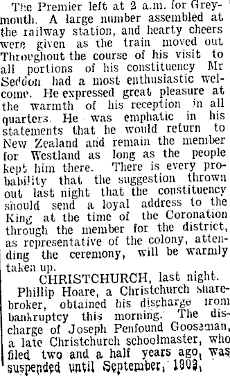 The Premier left at 2 a.m. for Greymouth. A large number assembled at the railway station, and hearty cheers were given as the train moved out Throughout the course of his visit to all portions of his constituency Mr Seddon had a most enthusiastic welcome. He expressed great pleasure at the warmth of his reception m all quarters. He was emphatic in his statements that he would return to New Zealand and remain the member for Westland as long as the people kept him there. There is every probability that the suggestion thrown out last night that the constituency should send a loyal address to the King at the time of the Coronation through the member for the district, as representative of the colony, attending the ceremony, will be warmly taken up. , ~, CHRISTCHURCH, last night. Phillip Hoare, a Christchurch sharebroker, obtained his discharge irom bankruptcy this morning- The discharge of Joseph Penfound Gooseman, a late Christchurch schoolmaster, who filed two and a half years ago, was suspended until September 13Q2)