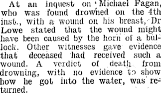 At an inquest on ‘Michael Fagan, who was found drowned on the 4th inst., with a wound on his breast, Dr Lowe stated that the wound might have been caused by the horn of a bullock. Other witnesses gave evidence that deceased had received such a wound. A verdict of death from drowning, with no evidence to show how lie got into the water, was returned.
