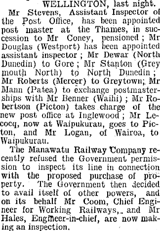 ' WELLINGTON, last night. Mr Stevens, Assistant Inspector of the Post Office, has been appointed post 'master at the Thames, in succession to Mr Coney, pensioned ; Mr Douglas (Westport) lias been appointed assistant inspector ; Mr Dewar (North Dunedin) to Gore ; Mr Stanton (Grey mouth North) to North ‘ Dunedin ; Mr Roberts (Mercer) to Greytown;. Mr Mann (Patea) to exchange postmasterships with Mr Benner (Waihi) ; Mr Robertson (Picton) takes charge of the new post office at Inglewood ; Mr Lecocq, now at Waipukurau, goes to Picton, and Mr Logan, of Wairoa, to Waipukurau. The Manawatu Railway Company recently refused the Government permission to inspect its line in connection with the proposed purchase of property. The Government then decided to avail itself of other powers, and on its behalf Mr Coom, Chief Engineer for Working Railways,. and Mr Hales, Engineer-in-chief, are now making an inspection.