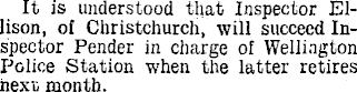 It is understood that Inspector Ellison, of Christchurch, will succeed Inspector Pender in charge of Wellington Police Station when the latter retires nexu month.