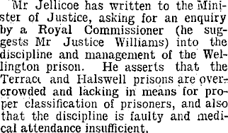 Mr Jellicoe has written to the Minister of Justice, asking for an enquiry by a Royal Commissioner (he suggests Mr Justice Williams) into the discipline and management of the Wellington prison. He asserts that the Terraci and Halswell prisons are overcrowded and lacking in means for proper classification of prisoners, and also that the discipline is faulty and medical attendance insufficient.