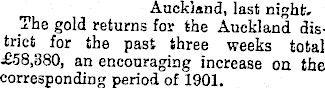 Auckland, last night, The gold returns for the Auckland district for the past three weeks total £58,380, an encouraging increase on the corresponding period of 1901.