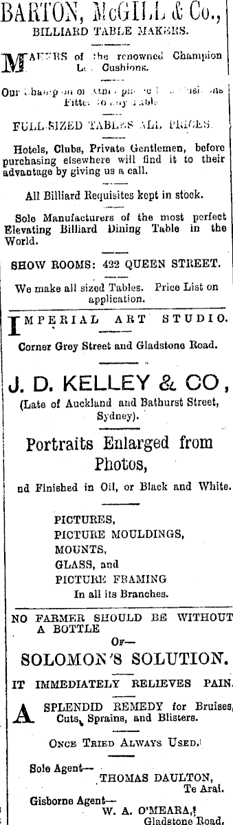 BARTON, McGill A Co., BILUAXtD TABLE MAKERS. MAT'T'Tlfi of the renowned Champion L. Cushions. Our - b&«-p -m oi .uni .pm u isi -ns i’ittl- o , ll y , FULL SIZED TABLES ALL PRICES Hotels, Clubs, Private Gentlemen, before purchasing elsewhere will find it to their advantage by giving us a call. All Billiard Requisites kept in stook. Sole Manufacturers of the most perfect Elevating Billiard Dining Table in the World. SHOW ROOMS: 422 QUEEN STREET. We make all sized Tables. Price List on application. JMPERIAL ART STUDIO. Corner Grey Street and Gladstone Road. J. D. KELLEY & CO, j (Late of Auckland and Bathurst Street, Sydney). | Portraits Enlarged from Photos, nd Finished in Oil, or Black and White. PICTURES, PICTURE MOULDINGS, MOUNTS, GLASS, and PICTURE FRAMING In all its Branches. NO FARMER SHOULD BE WITHOUT A BOTTLE Of— SOLOMOjS 'S solution. A IMMEDIATELY RELIEVES PAIN. SPLENDID REMEDY for Bruises, Sprains, and Blisters. Once Tkied Always Used. Sole Agent— THOMAS DAULTON, Te Arai. Gisborne Agent— W. A. O’MEARA,! Gladstone Road.