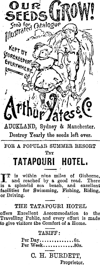 S\ ERI A m Sr/afes*^ s'* toH Catalogue, (11#* s? AUCKLAND, Sydney & Manchester. Destroy Yearly the seeds left over. FOB A POPULAR SUMMER RESORT Tey TATAPOURI HOTEL, IT is within nine miles of Gisborne, and reached by a good road. There is a splendid sea beach, and excellent facilities for SwimmiDg, Fishing, Riding, or Driving. THE TATAPOURI HOTEL offers Excellent Accommodation to the Travelling Public, and every effort is made to give visitors the Comfort of a Home. TARIFF: Per Day 6s. Per Week 30s. C. H. BURDETT, Proprietor.