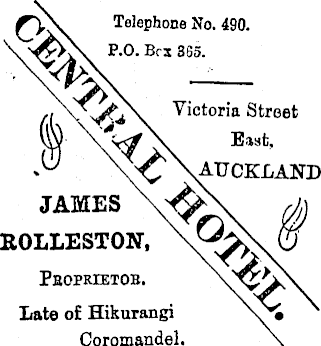 Telephone No. 490. O P.O. Bex 385. m /> Victoria Street \ ><b\ East, O 7>. r x\ 'X, \AUCKLAND JAMES ROLLESTON, PbOPRIETOB. Late of Hikurangi Coromandel.