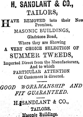 H. SANDLAKT & CO., TAILORS, HAVE REMOVED into their New Premises, MASONIC BUILDINGS, Gladstone Road, Where they are Showing A VERY CHOICE SELECTION OF SUMMER TWEEDS, Imported Direct from the Manufacturers, And to which PARTICULAR ATTENTION Of Customers is directed. GOOD WORKMANSHIP AND FIT GUARANTEED. H.jJSANDLANT & CO., TAILORS, Masonic Buildings*