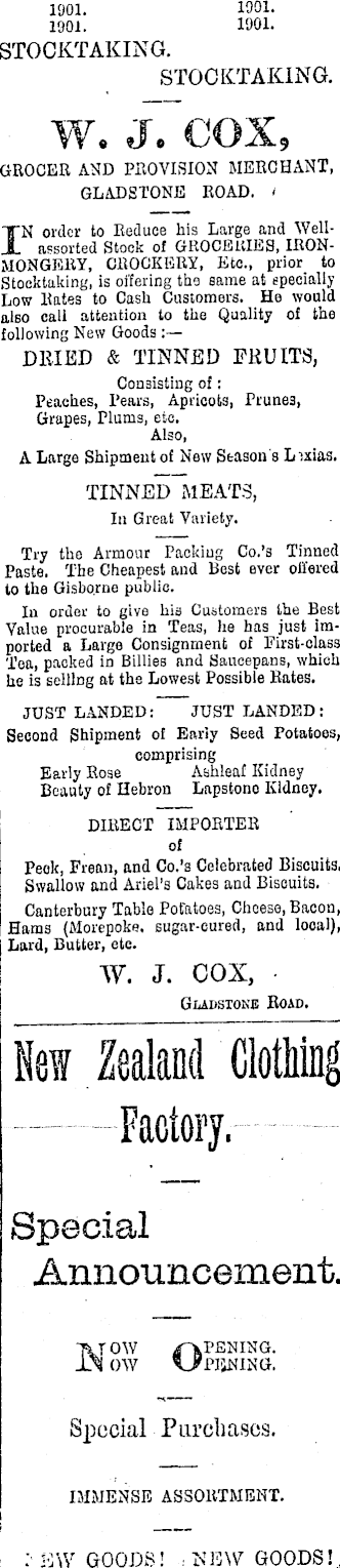 1001. 1901. 1901. 1901. STOCKTAKING. STOCKTAKING. W. J. COX, GROCER AMD PROVISION MERCHANT, GLADSTONE ROAD. < IN order to Reduce his Large and Wellassorted Stock of GROCERIES, IRONMONGERY, CROCKERY, Etc., prior to Stocktaking, is offering the same at specially Low Rates to Cash Customers. He would also call attention to the Quality of the following New Goods ; Dill ED & TINNED FRUITS, Consisting of: Peaches, Pears, Apricots, Prunes, Grapes, Plums, etc. Also, A Large Shipment of New Season s Lixias. TINNED MEATS, In Great Variety. Try the Armour Packing Co.’s Tinned Paste. The Cheapest and Best ever offered to the Gisborne public. In order to give his Customers the Best Value procurable in Teas, he has just imported a Large Consignment of First-class Tea, packed in Billies and Saucepans, which he is selling at the Lowest Possible Rates. JUST LANDED: JUST LANDED: Second Shipment of Eariy Seed Potatoes, comprising Early Rose Ashleaf Kidney Beauty of Hebron Lapstono Kidney. DIRECT IMPORTER of Peek, Frean, and Co.’s Celebrated Biscuits, Swallow and Ariel’s Cakes and Biscuits. Canterbury Table Potatoes, Cheese, Bacon, Hams (Morepoke. sugar-cured, and local), Lard, Butter, etc. W. J. cox, Gladstone Road. New Zealand ClotMnj Factory, Special Announcement. T\rOW OPENING. IN OW 'U'PIINING. Special Purchases. IMMENSE ASSORTMENT. .' EW GOODS! : NEW GOODS!,