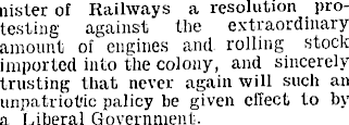 nister of Railways a resolution protesting against the extraordinary amount of engines and rolling stock imported into the colony, and sincerely trusting that never again will such an unpatriotic palicy be given effect to by a Liberal Government.