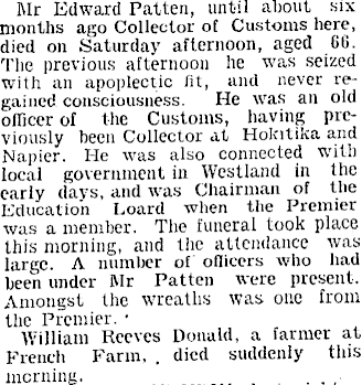 Mr Edward Fatten, until about six months ago Collector of Customs here, died on Saturday afternoon, aged GG. The previous afternoon lie was seized with an apoplectic fit, and never regained consciousness. He was an old officer of the Customs, having previously been Collector at Hokitika and Napier. He was also connected with local government in Westland in the early days, and was Chairman of the Education Loard when the Premier was a member. The funeral took place this morning, and the attendance was large. A number of officers who had been under Mr Patten were present. Amongst the wreaths was one from the Premier. • William Reeves Donald, a farmer at French Farm, . died suddenly this morning. _