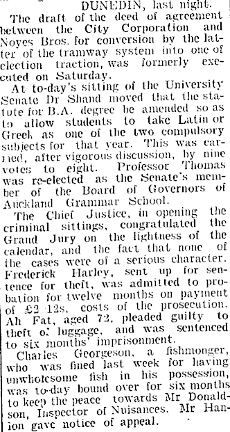 DUNEDIN, last night. The draft of the deed of agreement between the City Corporation and Noyes Bros, for conversion by the latter' of the tramway system into one of election traction, was formerly executed on Saturday. . At to-day’s silting of lhe University Senate Dr Shand moved that lire statute for B. A. degree be amended sons to allow students to take Latin or Greet as one of the two compulsory subjects for that year. This was earned, after vigorous discussion, by nine vote" to eight. Professor Thomas was re-elected as the Senate’s meat her of the Board of Governors oi A lick land Grammar School. The Chief Justice, in opening the criminal sittings, congratulated the Grand Jury on the lightness of the calendar, and the fact that none of the cases were of a serious character. Frederick Harley, sent up for sentence for theft, was admitted to piobation for twelve months oil payment of £° 12s, costs of the prosecution. All Fat, aged 72. pleaded guilty to theft of luggage, and was sentenced to six months’ imprisonment. Chailes Georgeson, a fishmonger, who was fined last week for having unwholesome fish in ins possession, was to-day bound over for six months to keep the peace towards Mr Donaldson, Inspector of Nuisances. Mr Hanlon gave notice oi appeal.