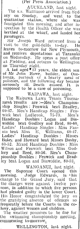 (Per Press Association.) AUCKLAND, last night. The s.s. Warrimoo arrived from Sydney on Sunday, and went to the tiuarantiuc station, where she was fumigated this morning, and after inspection by the Health Officer she was berthed at the wharf, and landed her passengers. Sir Joseph Ward returned from a visit to the gold-fields to-day. He leaves to-morrow for New Plymouth, and receives deputations at Taranaki on Wednesday. He opens a post office at Fielding, and returns to Wellington on Thursday night. A lad aged * 17 years, the eldest sen of Mr John Howe, builder, of Oneliunga, partook of a hearty meal of polonies, and the following day became seriously ill. Deatli ensued. It is supposed to he a case of poisoning. WAIPAWA, last night. The Waipawa Lawn Tennis Tournament results are:—Men’s Championship Singles : Fenwick beat- Bradley, 60—17. Men’s Handicap Singles : Fenwick beat Ludbrook, 75-73. Men’s Handicap Doubles : Logan and Dinwiddie beat Godfrey and Reid, 80-fifh Ladies’ Handicap Singles : Miss Fan- I nin heat Miss E. Williams, GO-47. Ladies’ Handicap Doubles : Misses Baker and Howard beat Misses Busby, GO-52. Mixed Handicap Doubles : Miss Wilson and Fenwick heat Miss Godfrey and Reed, 80-56. Men’s Championship Doubles : Fenwick and Bradley heat Logan and Dinwiddie, 80-52. WANGANUI, last night. The Supreme Court opened this morning. Judge Edwards, in -his charge to the Grand Jury, said that the charges were against twelve persons, in addition to which five persons had pleaded guilty in the lower Court. His Honor congratulated the .jury on the gratifying absence of offences so frequently before the Courts 'in the co- I lony, against women and children. The weather promises to be fine for the swimming championship meeting, commencing to-morrow^ WELLINGTON, last night.