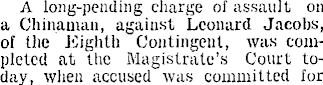 A long-pending charge of assault on a Chinaman, against Leonard Jacobs, of the Eighth Contingent, was completed at the Magistrate’s Court today, when accused was committed for