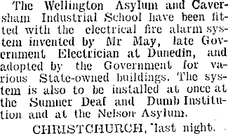 'Hie Wellington Asylum and Caversham Industrial School have been fitted with the electrical fire alarm system invented by Mr May, late Government Electrician at Dunedin, and adopted by the Government for various State-owned buildings. The system is also to he installed at once at the Sumner Deaf and Dumb Institution and at the Nelson- Asylum. CHRISTCHURCH, "last night.