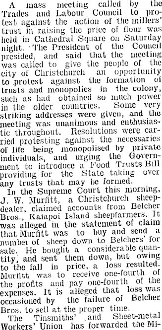 A mass meeting called by the Trades and Labour Council to protest against the action of the millers’ trust in raising the price of flour was held in Cathedral Square on Saturday night. The President of the Council presided, and said that the meeting was called to give the people of the city of Christchurch an opportunity to protest against the formation of trusts and monopolies in the colony, such a.s had obtained so much power in the older countries. Some very striking addresses were given, and the meeting was unanimous and enthusiastic throughout. Resolutions were carried protesting against the necessaries of life being monopolised by private individuals, and urging the Government to introduce a Food Trusts BiU providing for the State taking over any trusts that may be formed. In the Supreme Court this morning, J. W. Murfitt, a Christchurch sheepdealer. claimed accounts from Belcher Bros., Kaiapoi Island slieepfarmers. It was alleged in the statement of claim that Murfitt was to buy and send a number of sheep down to Belchers lor sale. He bought a considerable quantity, and sent them down, but owing to the fall in price, a loss resulted. Muriitt was to receive one-fourth ot the profits and pay one-fourth of the expenses. It is alleged that loss was occasioned by the failure of Belcher Bros, to sell at the proper time. The Tinsmiths’ and Sheet-metal Workers’ Union has forwarded the Mi-