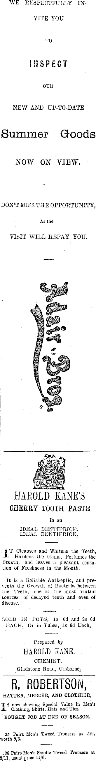 WE RESPECTFULLY INVITE YOU TO NSPEOT GUIS NEW AND UP-TO-DATE Summer Goods NOW ON VIEW. DON’T MISS THE OPPORTUNITY, As the VISIT WILL REPAY YOU. HAROLD KANE’S CHERRY TOOTH PASTE Is an IDEAL DENTIFRICE. IDEAL DENTIFRICE,. XT Cleanses and Whitens the Teeth, Hardens the Gums, Perfumes the Breath, and leaves a pleasant sensation of Freshness in the Mouth. It is a Reliable Antiseptic, and pretents the Growth ol Bacteria between the Teeth, one o£ the most fruitful sources of decayed teeth and even of disease. ►SOLD IN POTS, Is (id and 2s Gd EACH, Or in Tubes, Is 6d Each, Prepared by HAROLD KANE. CHEMIST. Gladstone Road, Gisborne/ R, ROBERTSON, HATTER, MERCER, AND CLOTHIER, T S now showing Special Value in Men’s JL Clothing, Shirts, Hats, and Ties. BOUGHT JOB AT END OF SEASON. 25 Pairs Men's Tweed Trousers at 5/9, worth 8/6. .20 Pairs Men’s Saddle Tweed Trousers at 8/11, usual price 11/G.