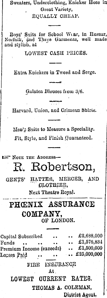 Sweaters, Underclothing, Knicker Hose in Great Variety, EQUALLY CHEAP. Boys’ Suits for School Wear, in Hussar, i Norfolk, and Three Garments, well made and stylish, at LOWEST CASH PRICES. Extra Knickers in Tweed and Serge. Galatea Blouses from a/6. Harvard, Union, and Crimean Shirts. Jlsn’s Suits to Measure a Speciality. Kit, Style, and Finish Guaranteed. ti“ Note the Address— R. Robertson, GENTS’ HATTER, MERGER, AND ' pLQTHIEE, Nest Theatre Boya!. PHffiNIX ASSURANCE COMPANY, OF LONDON. Capital Subscribed .. •. £2,638,000 Funds •. . • .. • • £1,576,834 ( Premium Income (exceeds) • ■ £1,500,000 | Lo;s.es Paid . • . • • • £25,000,000 FIRE INSURANCE 1 At. ! LOWEST CURRENT RATES. 5 THOMAS A. COLEMAN, < District Afjeul,