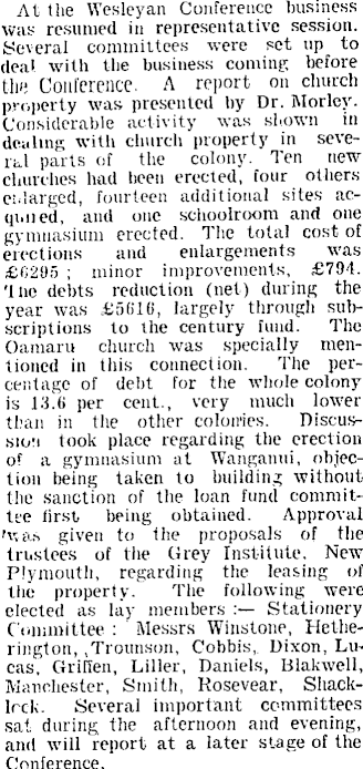 At the Wesleyan Conference business was resumed in representative session. Several committees were set up to deal with the business coming before till! Conference. A report on church property was presented by Dr. Morley. Considerable activity was shown in dealing with church property in several parts of the colony. Ten new ehurches had been erected, four others enlarged, fourteen additional sites acqi.iied, and one schoolroom and one gymnasium erected. The total cost of erections and enlargements was £6295 ; minor improvements, £794. ’Hie debts reduction (net) during the year was £561(1, largely through subscriptions to the century fund. The Oamaru church was specially mentioned in this connection. The percentage of debt for the whole colony is 13.6 per cent., very much lower than in the other colonies. Discussion took place regarding the erection of a gymnasium at Wanganui, objection being taken to building without the sanction of the loan fund committee first being obtained. Approval 'was given to the proposals of the trustees of the Grey Institute. New Plymouth, regarding the leasing of the property. The following were elected as lay members : Stationery Committee : Messrs Winstone, Hetherington, ,Trounson, Cobbis, Dixon, cas. Griffen, Liller, Daniels, Blakwell, Manchester, Smith, Rosevear, Shacklrck. Several important committees sat during the afternoon and evening, and will report at a later stage of the Conference.