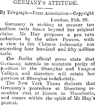 GERMANY’S ATTITUDE. By Telegraph—Tress Association—Copyright London, Feb. 20. Germany is seeking to recover ten million taels losses beyond her original claim. Mr Hay proposes a pro rata reduction by the other Powers, with a view to tho Chinese indemnity not exceeding four hundred and fifty million taels. The Berlin official press state that Germany intends to maintain parity of position in the Shanghai and Ynngtso \ alleys, and therefore will retain her garrison at Shanghai indefinitely. The New York Times declares that Germany's procedure at Shantung resembles that of Russia in Manchuria, and comes within the spirit of Mr Hay's protest.