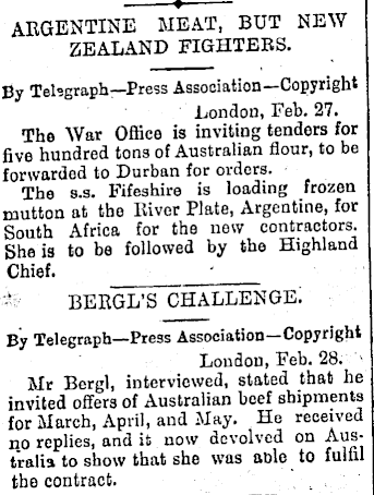 ARGENTINE MEAT, BUT NEW ZEALAND FIGHTERS. By Telegraph—Press Association— Copyright London, Feb. 27. The War Office is inviting tenders for five hundred tons of Australian flour, to be forwarded to Durban for orders. The s.s. Fifeshire is loading frozen mutton at the River Plate, Argentine, for South Africa for the new contractors. She is to be followed by the Highland Chief. BERGL’S CHALLENGE. By Telegraph—Press Association— Copyright London, Feb. 28. Mr Bergl, interviewed, stated that he invited offers of Australian beef shipments for March, April, and May. He received no replies, and it now devolved on Australia to show that she was anle to fulfil tho contract.