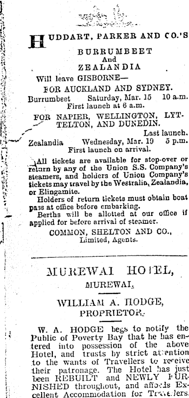 n&’ljHh \'i}' UDDART, PARKER AND CO.’S BDBBUMBEET And ZEALANDIA Will leave GISBORNE—IOR AUCKLAND AND SYDNEY. Burrumbeet Saturday, Mar. 15 10 a.m. First launch at 6 a.m. FOR NAPIER, WELLINGTON, LYTTELTON, AND DUNERIN. Last launch. Zealandia Wednesday, Mar. 19 5 p.m. First launch on arrival. vAll tickets are available for stop-over or rakarn by any of the Union S.S. Company’s steamers, and holders of Union Company’s tickets may travel by the Westralia,Zealandia, or Elingamite. Holders of return tickets must obtain boat pa3s at office before embarking. Berths will be allotted at our office if applied for before arrival of steamer. COMMON, SHELTON AND CO., Limited, Agents. 31U JIEWAI HO 1 EL, MUREWAI, WILLIAM A. HODGE, PROPRIETOR.W. A. HODGE begs to noLifv the Public of Poverty Bay that he has entered into possession of the above Hotel, and trusts by strict at ention to the wants of Travellers to receive their patronage. The Hotel has just been REBUILT and NEWLY BURNISHED throughout, and afiocis Excellent Accommodation for Trv.t.lers;