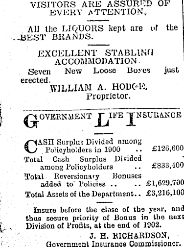 VISITORS ARE ASSURED OF EVERY .ATTENTION, All the LIQUORS kept are of the -BEST BRANDS. EXCELLENT STABLING ACCOMMODATION Seven New Loose Boyes just erected. WILLIAM A. HODC-E, Proprietor. £126,600 CASH Surplus Divided nmong Poiicyho'.ders in 1900 Total Cash Surplus Divided among Policyholders •. £833,100 Total Reversionary Bonuses added to Policies .. .. £1,629,700 Total Assets of the Department.. £3,210,100 Insuro before the close of the year, and thus secure priority of Bonus in the next Division of Profits, at the end of 1902. J. H. RICHARDSON, Government Insurance Commissioner.