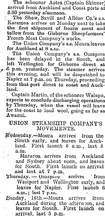 The schooner Aotca (Captain Skinner) arrivod from Auckland and Coast ports at 8.80 yesterday afternoon. Tho Shaw, SavilJ and Albion Co.’s s.s. Karamea arrives on Monday next to take the first shipment of frozen meat and tallow from the Gisborne Sheepfarmers’ Frozen Meat Company’s works. The Union Company’s s.s. Moura leaves for Auckland at 8 a.m. Tho Union Company’s s.s. Omapere has been delayed in tho South, and left Wellington for Gisborno direct at r £> p.m. yesterday. Tho steamer arrives this evening, and will bo despatched to Napier at 7 p.m. on Thursday, proceeding from that port direct to coast and Auckland. Captain Martin, of the schooner Waiapu, expects to conclude discharging operations by Thursday, when the vessel will leave for the coast to load wool, going as far as Awanui. UNION STEAMSHIP COMPANY’S MOVEMENTS. Wednesday.—Moura arrives from the South early, and leaves for Auckland. First launch 6 a.m., last 8 a.m. Mararoa arrives from Auckland and Sydney about noon, and leaves for South. First launch on arrival and last at 7 p.m. Thursday. Omapero arrives ' from Westport and Wellington early, and leaves for Napier. First launch 6 a.m.; last 7 p.m. Sunday, I6th.—Moura arrives from Auckland during the afternoon, and leaves for South. First launch on arrival, last 5 p.m.