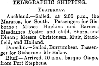 TELEGRAPHIC SHIPPING. Yesterday. Auckland. —Sailed, at 2.30 p.m., the Mararoa, for South. Passengers for Gisborne : Misses Hopkins and Barnes; Mesdames Foster and child, Sharp, and Dinan ; Messrs Christensen, Muir, Stackfield, and Holland. Dunedin. — Sailed, Burrumbeet. Pussengei for Gisborne : Mr Baker. Bluff. —Arrived, 10 a.m., barque Otago, from Port Stephens.