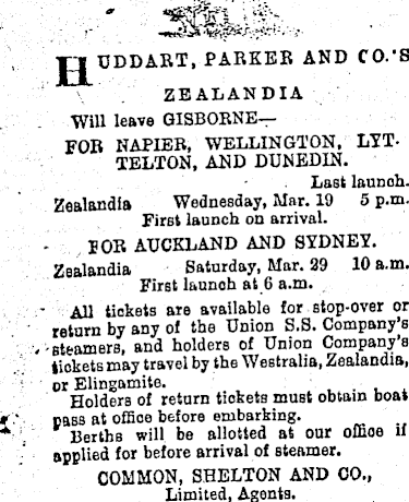 EL UDDART, PARKER AND CO.’S ZEALANDIA Will leave GISBORNE—FOB NAPIER, WELLINGTON, LYTTELTON, AND DUNEDIN. Last launch. Zealandia Wednesday, Mar. 19 5 p.m. First launch on arrival. BOR AUCKLAND AND SYDNEY. Zealandia Saturday, Mar. 29 10 a.m. First launoh at 6 a.m. All tickets are available for stop-over or return by any of the Union S.S. Company’s . Bteamers, and holders of Union Company’s tickets may travel by the Westralia, Zealandia, or Elingamite. Holders of return tickets must obtain boat pass at office before embarking. Berths will be allotted at our offioe if applied for before arrival of steamer. COMMON, SHELTON AND CO., Limited, Agents.