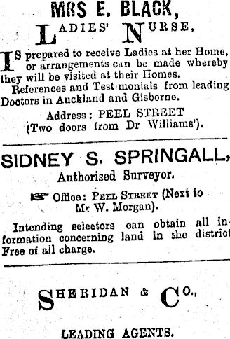 ms E. BLACK, - ADIE S’ -j^-URSE, IS prepared to reoeive Ladies at her Home, or arrangements can be made whereby they will be visited at their Homes. References and Testimonials from leading Doctors in Auckland and Gisborne. Address: PEEL STREET (Two doors from Dr Williams’). SIDNEY S. SPRINGALL, Authorised Surveyor. &• Office: Peel Street (Next to Mr W. Morgan). Intending selectors formation concerning Free of ail charge. can obtain all inland In the district gHERIDAN & COLEADING AGENTS,